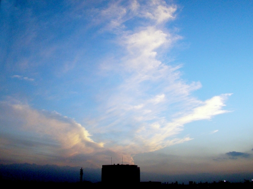 梅雨時の通り雨を遠くから移したものです右側から中央の地表に伸びてきている黒い雲が雨雲です雨雲が伸びている先は、丁度清瀬市付近です(東京アメッシュを参考に判断したものです) 撮影者:ヒロちゃん Photo by SONY DSCH9 20100616 1646撮影
