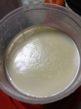 水とお湯と専用のパウダーだけでヨーグルトが作れちゃう?、ニュージーランド初の手作りヨーグルト イージーヨーという商品を今回試してみましたお試しセットの中には、このヨーグルトパウダー(1袋で10杯分のヨーグルトが作れるそうです)2種類と、ヨーグルトメーカーが入っていました作り方は簡単!手順に沿って容器の中で1Lの水道水でパウダーを溶かしたら、1Lちょっとの熱湯を注いだジャーの中に容器をセットするだけ牛乳も何も要りませんパウダーはニュージーランドのミルクを使って材料を乾燥させた物だそうで、お湯で温められるとヨーグルトが出来上がるんだそうです容器をセットしたら、ジャーに蓋をして10時間放置するだけ約10時間放置後の容器の中身!ホントに固まって、ヨーグルトが出来上がってました!!容器の下の方に乳清が溜まっているので、スプーンで全体をかき回せば完成 さっそく試食! 結構甘めのヨーグルトですが、市販品よりも断然おいしいかな! パウダーはローファットの物とか、甘さを抑えたのとか、いろいろとあるようなので、好みの物が見つかったら中々いいんじゃないでしょうかねぇ! 出来上がったヨーグルトは冷蔵庫に入れれば2週間は持つとの事 続きを見る ['close']