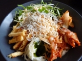 急いでいるときに大活躍のメニューです お湯を沸かして素麺を茹でます 茹で上がり1分前に乾燥ワカメも入れます 一緒にざるにあげ、水でしめたら 皿に乗せ、キムチ納豆揚げ玉大根おろし水菜ざくぎり油揚げ細切り、など 冷蔵庫の材料と時間に合わせて、具を乗せます めんつゆをかけたらできあがり♪ 一番早いのは、キムチとごまのみ でも、これでもおいしいですよ 続きを見る ['close']