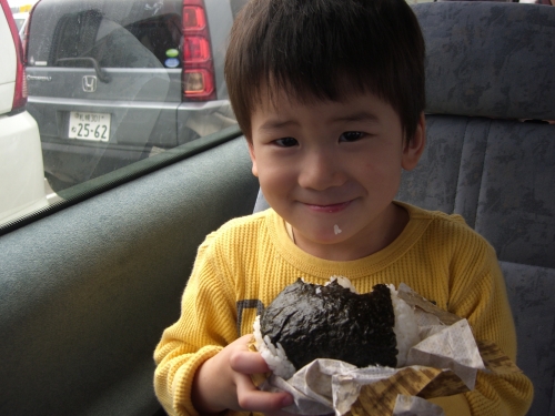 ドライブに行ったとき、特大のおにぎりを、小さなお口でパックン! だけど、このおにぎり、重いよっ