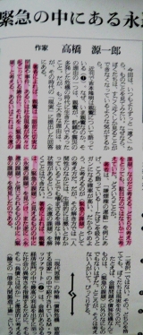 中沢*吉本隆明さんが「原子力を否定することは人間がサルに戻ることだ」と 発言したのも、おそらく真意は別のところにあった 科学技術そのものを否定してはいけない、と言いたかったと思う でも、石原慎太郎さんが「吉本隆明もサルになると言っている」と 引用したことで、「原発推進」の論理にすり替えられてしまう ほんとうに吉本さんがおいたわしくて 内田*原発は人間の要求に奉仕するただの道具にすぎないという話に 落とし込んで、原子力に対する恐怖をごまかしてきたんだけれど、 実際はそんなごまかしが効く相手じゃなかったんだ だから、事故の後、「罰が当たった」という言葉が 説得力を持ったんじゃないの ↑ 週刊現代 特別対談 中沢新一×内田樹 朝日新聞 高橋源一郎 ↓ 著者は、「嫌煙権の運動」を例にあげ、こう語っているーーたばこを吸うとガンになる確率は高い、だからやめよう、と考えるんのが〈緊急の課題〉としての考え方だ だが、その解き方では「人間性のなかには、生理的には悪いとわかっていることでも嗜まざるを得ない精神状態があるという」〈永遠の課題〉を解くことはできない これまでの関連エントリーから 吉本隆明 語る沈黙から芸術まで 2009/1/4 http//blogsyahoocojp/atorasu99/archive/2009/1/4 とおくまでゆくんだ(8) 2008/10/5(日) 午後 203 http//blogsyahoocojp/atorasu99/56858053html 住むことについてのこだわり(10) 2008/9/30(火) 午後 801 http//blogsyahoocojp/atorasu99/56802460html 戦争はみんな悪だと考えたほうがいい(3) 2008/8/11(月) 午後 936 http//blogsyahoocojp/atorasu99/56219657html 【井村屋】ようかんを非常食に!「えいようかん」のモニター大募集!←参加中 http//moniplajp/bl_rd/iid12740043724f2f916202922/m4be651696a51a/k2/s0/ 続きを見る ['close']