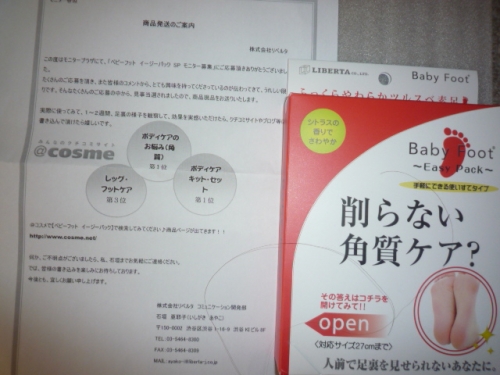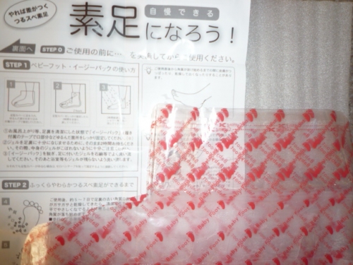以前にどこかのサイトで見てから使ってみたかったんです!! 中を開けるとアルミパックが入っていてパックの中には、 液体が入ったビニールソックスが入ってます こんな感じ↓ お風呂に入った清潔な状態の足でこのソックスを履いて2時間待ちます ソックスを履いてみると少しとろみのある液体が足について、 気持ちいいような、気持ち悪いような不思議な感覚 ちなみに中の液体はシトラスの香りなので履いていると 足元からシトラスの香りがします 臭いわけではないんだけどずっと香ってきて頭が痛くなりました 香りはいっそのこと無くすかシャボン系で目立たない香りくらいのほうがいいと思います ソックスを履くと歩きづらくなるので我慢しながら 2時間後に流しに行きました 流したあとの足は少しカサついた感じ このまま放っておくだけで角質がベロベロ剥がれるのか心配になります でも4日ほど経つとところどころ皮がめくれてきていました!! さらに時間が経てば経つほどボロボロとめくれて、めくれた後の足はツルツルになりました!! すべて角質が取れた足は全体がスベスベで嬉しいのですが、 かかとのカチカチにも効果があると書いていたのに効果が感じられなかったのが残念です 後は置く時間が長いことや、見た目の悪さ、そして皮があちこちで剥がれてしまうことへの改善を期待します効果はありますがコチラの問題点があるため、特別な理由が無い限り使用したいとは思いません (ベビーフットを使用する方は部屋に皮が落ちるので、コロコロを用意しておいたほうがいいと思います!!) 続きを見る ['close']
