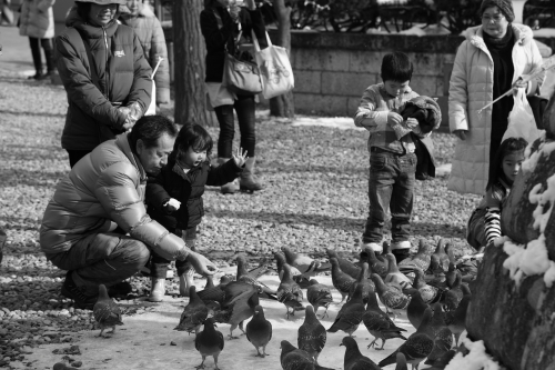1月初旬、雪の残る善光寺(長野)へ初詣に出かけました♪ 雪がちらついたりもする天候でしたが、残った雪の上を元気に歩き回る鳩ちゃん達に、 一生懸命餌をあげている女の子がとっても可愛く思わず撮ってしまった一枚です♪