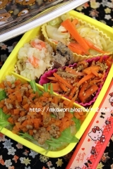 2016年、最初の幼稚園お弁当でしたがにんじん満載に(笑)にんじん愛好家か!?t突っ込まれるレベルに段々、朝起きるのがつらい季節になってきたけど、頑張らないとね!!!にんじんのそぼろ丼コールスロー和風ポテトサラダにんじんとツナのサラダ2色の胡麻ハム後で写真を見て振り返ると、ひじき料理のひとつでも入れれば良かったかなと思いますにしても、にんじん率の高さに自分でも驚きました結婚して 続きを見る ['close']