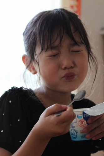 学校から帰ってきたら「おいしいヨーグルト食べる!」と、冷蔵庫へ一目散 蓋をあける顔がうれしそう 一口食べると「うんおいし!」と、至福のひと時のようです あっという間に食べきって、きれいにきれいにさらっています 甘さがちょうどよくってあとくちが最高なんだそうです♪