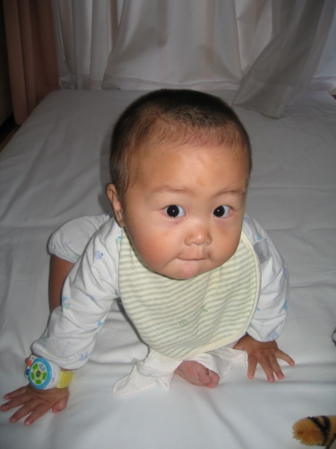 ママの一押し写真です なかなか頭が上がらなくて、すぐに疲れて泣いていたのに、 あっという間に《飛行機ブーン》が出来るようになったね ハルの笑顔が、ママの癒しです!