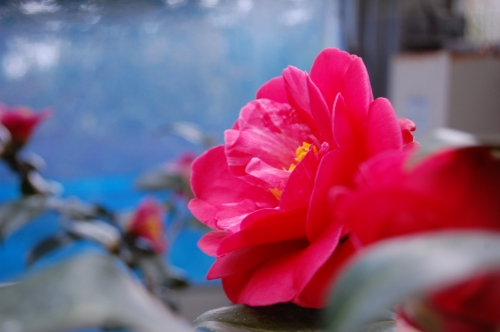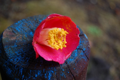 美しく咲き、まるごと落下する椿たまたま青いペンキの塗られた杭の上に運命的に落下していました