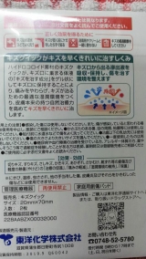 gable="false" alt="括弧" src="http//emojiamebajp/img/user/gy/gyuutte/70505gif">東洋化学さんのキズクイックモニターさせていただきました こちらのキズクイックは傷の痛みをやわらげ、早くきれいに治すモイストヒーリング効果のある絆創膏です 傷口からでる滲出液を吸収保持し、傷を治す環境を整える働きがあるそうです いままで傷口って絆創膏貼るとジュクジュクするから貼らずに乾燥させるのがいいって言われませんでしたか? 今はモイストヒーリング(湿潤療法)が傷を早く治す効果があるそうですよ 従来の絆創膏のように傷口部分にガーゼがないので、傷口に繊維がつかないのがいいですね 粘着力もしっかりありいい感じです 水仕事もしてみましたが、傷口が水で濡れないのでこれなら痛くありませんね ですが、しっかり接着面を付けていないと粘着力が落ちてはがれてきてしまいました 残念 透明なので肌になじんで、絆創膏を付けているのが分かりにくいのもいいですね 家の薬箱に1個は常備しておいたほうが安心です 添付文書(表) 添付文書(裏) モニプラファンブログさん、東洋化学株式会社さん、キズクイックのモニターに選んでいただきありがとうございました 東洋化学のファンサイトファンサイト参加中 続きを見る