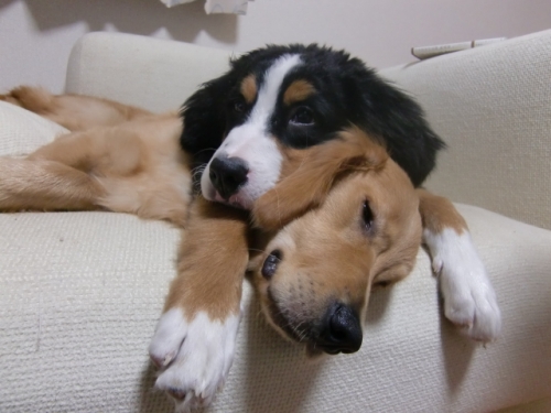 わが家のゴールデンとバーニーズの姉妹です お姉ちゃんを枕にしてお昼寝中
