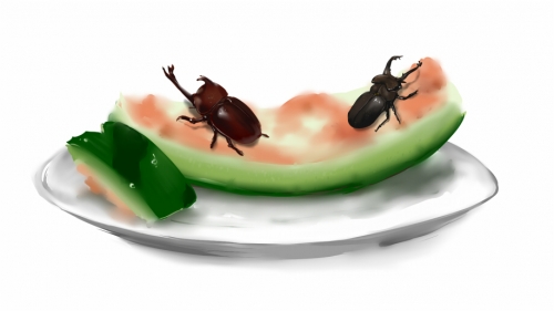 やっぱり夏と言えばスイカです!スイカによってくる虫です 現実にはありさんばっかりでしたが、かぶととかクワガタとか見てみたいですね