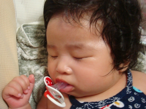 今月で3カ月になる娘です さっきまでおしゃぶりを勢いよく吸っていたのに、 眠気に負けていつのまにかスヤスヤ おしゃぶりが半分口から抜け落ちてきてます(笑)