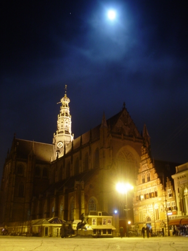 オランダに行った時、ハーレムという街の教会の写真ですこの写真を撮る直前まで雪が吹雪いてました 地面にはうっすらと雪が積もってます 雪が止んで月が見えてとても幻想的だったので思わず記念に残しました