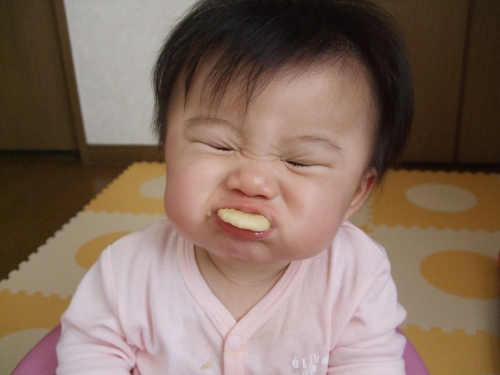 赤ちゃんせんべいを初めてあげた時の写真です とっても良い写真が撮れたかな(笑) 野菜味だったから美味しくなかったのか、こんな表情に^^; でもそのうち美味しく?食べれるようになりました^^