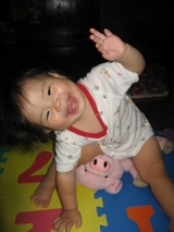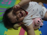 私がブタさん雑貨が好きなんで、ブタさんがたくさんいる我が家 月ちゃんもすっかりブタ好きになってくれました ソファに置いてるブタさんを引っ張り落と