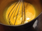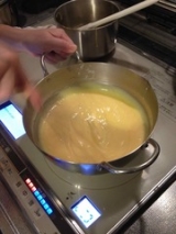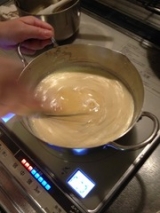 いつものお菓子作りや料理に使う生クリームは タカナシ乳業さん クリームチーズは初めてです 美味しいのでこのまま、パンやクラッカーに乗せて 頂きたいですね 今回は生クリーム(35)&北海道クリームチーズを使って 家族も大好き チョコとクリームの二層のチーズケーキにしました 今回は(6号サイズ1台分) タルト皿にグラハムクッキーなどお好みの物を砕いて、バターと冷やし固めて準備しておきます 生クリームはホイッパーで泡立てておきます 美味しいカスタードクリームを作ります 卵黄3個位 お砂糖50g 強力粉20g ゼラチン全体の2%ぐらい 邪道なやり方ですが、失敗しない方法は 火にかける前に全ての材料をホイッパーでよく混ぜておく 牛乳50CCにバニラビーンズ(無ければエッセンス、オイルでもOK)を入れて 中火にかけて、鍋底がこげつかない様に混ぜ続ける 段々トロトロになって来ますが、温度計で一旦85度くらいまでは上げて下さい (卵の殺菌です) 火から下ろして、温かいうちに湿潤しておいたゼラチンお好みでバター、リキュール(私はキルッシュ、コアントローなどが好きです) このカスタードは本当に美味しいですよ〜濃厚で 冷凍もできますので、時間がある時に作っておくと、シュークリーム、タルトなど色々使えて便利 クリームチーズは室温で柔らかくしておきます 『タカナシ北海道クリームチーズ』初めて使いましたが 柔らかくなめらかで、とっても使い易いです カスタードクリーム、柔らかくしておいたクリームチーズ、ホイップしたクリーム全てを混ぜます(温度を同じくらいにして下さい) 今回は4分の1くらいにココアを混ぜチョコ生地にし、2層にしてみました(完成図の断面) このままチーズだけでも充分美味しいです 準備しておいたタルト皿にタルトリングを乗せて 上記を流し入れ、冷凍庫で固めます (冷蔵でも良いのですが、タルトリングを外す時に冷凍の方が綺麗に抜けます) お客様の時など、冷蔵庫がいっぱいで大変だーって事もあると思いますが 少し室温でおいて、丁度食べごろと言うのも便利です と良いながらあまり綺麗にできませんでしたが(笑) 仕上げに、ホワイトチョコを削って雪を降らせ サンタにもみの木でクリスマスケーキに如何でしょうか? タカナシ乳業ファンクラブファンサイト参加中 続きを見る ['close']