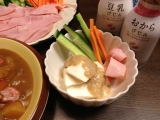 先日、正田醤油さんから2本のドレッシングが届きました今回、モニターさせていただくドレッシングはSOY=大豆のドレッシングなんです♪豆類大好きな私には、すごく嬉しいドレッシングですそして、実のところ味のほうは豆乳のような感じ?と思っていたら!全然、豆乳のようなさらっとでは無く豆をすりつぶしたような舌触りで、味もしっかりしていて相当美味しいですまず、今日はカレーだったのでサラダに使おうとゴマドレッシング私たちは、サラダにかけて食べていたのですが結構どろっとしているので、パパ用に人参ときゅうりをステックにしてつけて食べてみましたこれも、美味しい!私は、もちろん大豆生まれのドレッシングと大豆から出来た豆腐でいただきました♪これが、すんごい濃厚になって美味しくて娘も美味しい美味しいとほとんど食べられてしまった次は、ごぼうでゴマドレッシングを試したいですそして、明日はシーザードレッシングをいただきます♪今回の気になった点は、ちょうど実家の母が来ていて気になったのですがドレッシングの字が読みづらいところですドレッシングという文字をもう少し大きく書いてもらえれば年配の方でも見やすいと思いました正田醤油のファンサイトファンサイト参加中