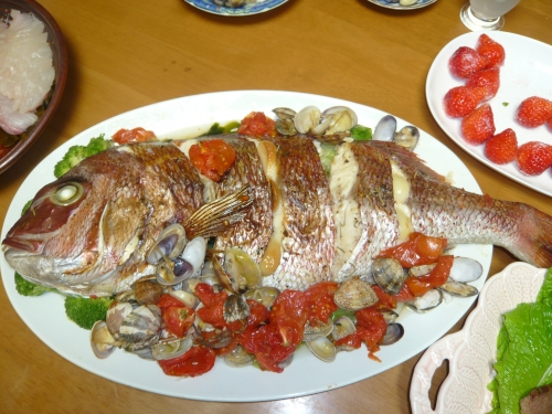 おじいが釣った鯛と畑でとれた野菜を使って 作りました♪ ほとんどお金かからずです