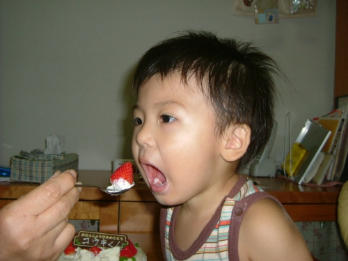 2歳の誕生日で大好きないちごをパクリ!! 大きなお口がかわいいね!