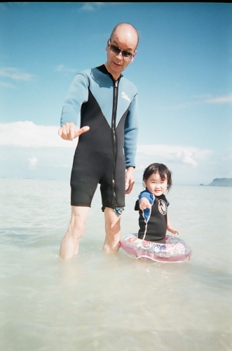 あばら骨を骨折しながら、孫との思い出のために、2人共、生まれて初めてウエットスーツを身につけ、船から、深い部分を渡って、有名なサンドバーにたどりつき、「はい、ポーズ!」ハングルースの、、ポーズ、、、ちょっと、違うけど、、最高♪