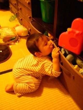 おもちゃ箱にしがみついてピクリとも動かない11ヶ月の息子 何をしてるのかと回りこんでみるとこんな体勢で寝てました…