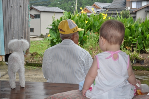 はじめておおじいちゃんの所に遊びに行きました とっても暑い夏でしたが、おおじいちゃんと愛犬と一緒に田舎の風にあたって楽しみました!
