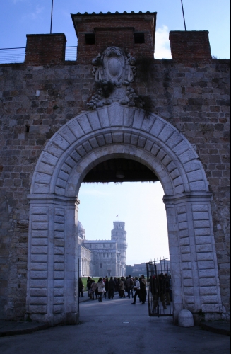 有名なピザの斜塔はどんな所にあるんだろう?と思いつつ 高い高い城壁の横を歩いてゆきました そして門の先に見えてきました みんな思わずワッと声をあげてしまいました