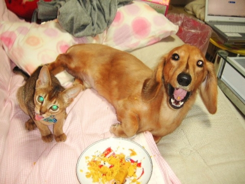 この日は2匹とも誕生日だったのでペット用の誕生日ケーキを買ってきましたー ケーキの写真も撮りたかったのですが、ガっついてるので、そっこー跡形もなく 犬はダラダラ食いしてますが満足そうでした今でもこの子たちは仲良くやってます♪