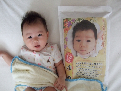 実家では送ったお米袋をお布団に寝かせていて、まるで孫を 寝かせているような扱いで笑ってしまいました♪ 「こっちを見ている」と父と母で盛り上がっていたそうです せっかくなので、実家のお布団に寝ているお米袋と一緒に パチリ!! 少しの間にすっかり成長した孫の姿に心和むひと時でした