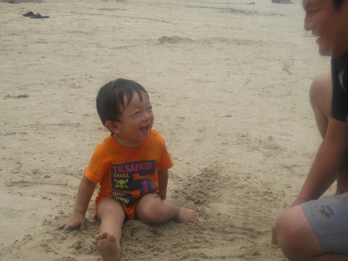 今年初めて海水浴に行った時の写真です砂浜でパパに遊んでもらってパパと顔を見合わせて大笑い あまり笑うと目が鶴瓶師匠みたくなるよ