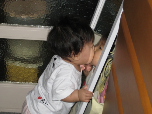 やっとつかまり立ちが 鏡がきにいったようで♪
