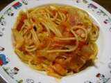 これはお昼に作ったパスタです作り方は簡単、麺を茹でている間にトマトベースのソースを作ってしまいます 今回はキャベツとベーコンがあったのでそ