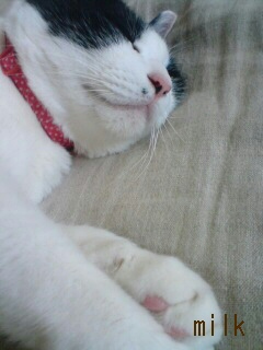 いつも、寝てばかりのにゃんこです家族が「ただいまー」と帰ってくると、大あくびしながら、玄関へおむかえに毎日、すやすや気持ちよく眠る、みるくちゃんです