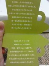 先日、イーネットさんの座談会に参加してきました普段お世話になるATM気になってしまうのが、手数料毎月、住宅ローンの返済のために、三菱UFJ銀行の口座からお金をおろして、住信SBIの口座に入れるという作業をしていますネットバンキングすればよいのですが、手数料が勿体なくってわざわざ、週末、隣駅まででかけて、銀行のATMで引き出してそこから少し歩いてコンビニATMで入金という面倒くさいことをしていましたコンビニATMで入金するときに、enetというロゴが画面に出るので、いつも利用しているATMはイーネットだという認識はしていましたが、自分の知らない便利な情報を得られたらいいなと思って座談会に参加しましたコンビニATMの種類って5つなんですねあたしがよく利用するのは一番左のものかなイーネットを支えている会社の説明等、ちょっと固いお話もありましたが、トリビアクイズなんてコーナーもあって、とても楽しかったです座談会はブロガー13名だったのですが、ブロガーさんのよく使う銀行を例にとってコンビニATMでも、引出手数料が月数回は無料なんですよとか早朝でも引き出せるので緊急時に便利だとか、なるほどと思うことが聞けて、とても役に立ちましたあたしの住宅ローンの支払ですが、わざわざ隣駅まで行って銀行ATMを使わなくても、家から2分のコンビニATMで、三菱から引き出して、そのまま住信SBIに入金できることが判明(色々な条件があるので、気になる方は調べてみて下さい)手数料無料ではできないという思い込みがあって、面倒くさいなって思っていましたが、簡単に解決しちゃいましたあたしにとっては大収穫です(笑)そして、銀行ATMって、なんとなくまわりの人が気になりませんか?狙われている?みたいな夕方とか、とくにドキドキコンビニだったら、店員さんもいるし、なんとなく安心できますよね同条件だったら、コンビニATMを選ぶなぁコンビニATMでも、防犯カメラ、セコムと、安心して使えるのがいいですね座談会では、ラテールの美味しいケーキをいただき、お菓子の詰め合わせまでお土産でいただいてしまいましたイーネットのATM、田舎のほうでも活躍しています佐渡島でも、コンビニに設置されているとのこと(佐渡には9台ですって)旅行雑誌にも載っているんですね販促グッズもいろいろ工夫されていて、興味深いのですが、今回いただいたのは、イチゴのキャンディなんと10袋も頂きました職場でおすそ分けこの飴好きなの^^と喜んでくれる人が多かったですせっかくの販促グッズ、やっぱり喜んでもらえるものが嬉しいですものねイーネットの社員の方たちも調査して人気のあるものにしているそうですいただいたお菓子の中のメッセージイーネットのATMサービスに込める「安心安全」という想いをいただいたお菓子(からだにやさしい安全なお菓子)に託してくださったとのこと無添加なものを好むあたしにとっては、とても嬉しかったですコンビニATMは手数料がと思われる方、是非ネットで調べてみて下さいもしかしたら、思い込みだけだったりするかもしれませんよ便利にATMを使いたいですね♪株式会社イーネットファンサイト参加中 続きを見る ['close']