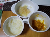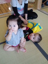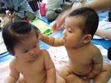 今日のベビー体操はいつも以上に笑えました後ろに小さく写ってるくるみちゃん音楽にあわせて踊ってる途中で睡魔に負けて爆睡しちゃいましたりくくんとみづき今日も仲良しですお猿さんみたいかずまくんは人形に人工呼吸してました(写真とりわすれたぁ)一番笑えたのがみづきが立ったままおしっこしちゃったんです小便小僧のように”シャ”って私のズボンはビチャビチャ本当は男の子じゃないの?ってくらいとばしてました(笑)タマゴがゆ青梗菜とにんじんのだし煮ダノン初タマゴです味はいまいちな反応ですがアレルギー反応は大丈夫そうです本日2回目の食事じゃがいもがゆ納豆入りかぼちゃのマッシュりんご カップメン3 !?発売記念!モニター【30名】募集!さらに先着100名に
