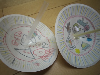 保育園での親子製作です(右は母の作品です) はさみを使って、紙皿を切ったり、絵を描いて好きなデザインを描いたり、とても楽しそうでした家でもどんどんはさみやノリをつかって工作させてあげたいと思いました