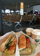 済州島出発の朝 「朝食はサブウェイで!」と思っていました ところが、 成田空港第1ターミナルにあるはずだけど なかなか見つからなかった 中央ビルのショップが並んでいる所ではなく 南ウィングの チェックインカウンター A と Z の先 ミーティングポイントの奥で 飛行機が ちょっと見える場所でした♪ コーヒーがリニューアルされ レインフォレスト認証農園産コーヒー豆を使用した 本格派オリジナルブレンドに! ちょっと苦めな大人味になった感じ サンドイッチは 私は定番の「 アボカドベジー 」 娘は「ツナ」ちょうど木曜日の〔得サブ〕でした ホント、お得! パンはハニーオーツ レタストマト増量 までが二人一緒 私はオニオン抜き バルサミコソースで! 自分好みのサンドは やっぱり嬉しいなぁ (^^)v 5月度!サブウェイのサンドイッチの感想を大募集!! ←参加中 続きを見る ['close']