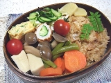 今日の弁当は、鯛の炊き込みご飯弁当 味付きご飯なので、おかずはあっさりと和風で高野豆腐としめじの煮物(高野豆腐、丹波しめじ、インゲン豆、人参