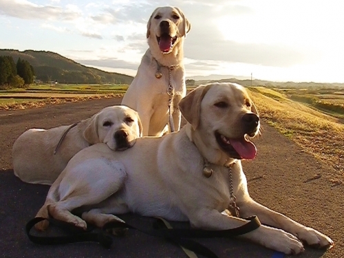 さんざん走り回った後なんです みんな満足、母ちゃんは息子の背中にあご乗せてのんびり・・・ 親子ワンコに夕日が優しく輝きます
