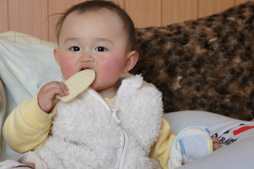 歯が生えてきだして噛むときの音を楽しんでます♪ でも、お姉ちゃんによくお菓子を『あーん』ってしてます