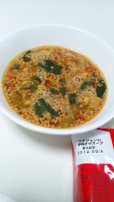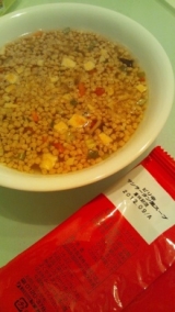 新日本製薬ファンサイト応援中 ヒートダイエット スリムホットスープが届きました♪ ヒートダイエット スリムホットスープとは一食をこのスープに 置き換えて食事をするという物しかも下記の栄養素がたっぷりで女性に嬉しく健康的なのがGOOD! 5つの味でスパイシーな香辛料、薬味、酢レシピが美味しさのこだわりで 5つの味に7つのスパイスを使用しているそうです 早速 パッケージからしてからそうw <内容量>5食 生姜と溶き卵の【サムゲタンスープ】 鯛と山椒のゆず皮入り【和風スープ】 コチジャンの辛味【チゲスープ】 ピリ辛【サンラータン風スープ】 オリジナルスパイスの【スープカレー】 中身も一緒のパッケージで裏に味が書いてありました! 一日目、サンラータンスープ! 最後にあと味が酢っぽい感じで美味しい♪ 鷹の爪は辛いけどもw 二日目、辛味チゲスープ これは辛いwでも味が本格的で美味しかったー! でも辛くってちょっと白米一緒に食べちゃいました(ノ◇≦) 早速ルールー違反ww 三日目、和風スープ 和風なだけあってかとってもまろやかで山椒の 風味がでてて美味しかった! 四日目、サムゲタンスープ これもとっても美味しい!生姜がほんのり卵とよく合う! 五日目、カレースープ 皆が好きなカレーのスープ間違いなく美味しいですよねw はじめは固形に固まってるけどお湯注いだ瞬間に 綺麗にファーって広がってそれが気持ちいい!!w 小さいお茶漬けのあられ見たいのは ひき肉っぽいけど、粒状大豆タンパクといって 大豆を主原料とした純植物性の粒状タンパク質 脂質は少なめでタンパク質は豊富に含まれています お肉の様な食感で食べやすいのが特徴だそうで なるほどーって感じこんなに小さいのにしっかり 噛み応えがありました!!具もしっかり噛める硬さ でも一個一個が小さいので本当しっかり意識しないと ごくっと飲みこんでしまいそう...w でも全般的に味はしっかり本格的でとってもダイエット食には 思えない満足感 ただスープなのでやっぱり一食には多少物足りないw ちょっと白米食べちゃったりしたけど HP見てたら、物足りない時のこともしっかり書いてあったw お勧めはしらたき、春雨、マロニーを加えると100kcalくらい 白米で150kcalくらいお麩で90kcalくらいみたい 納得です春雨とかこんにゃく麺入れてほしいなーって思ったけど それではスープって名前のコンセプト変わっちゃうもんね! 思ったこと先に書いてあってさすがって感じでした トータル的には大満足!! 五日間試して体重は1kg 食べたらすぐ戻っちゃうけど1カ月とかしっかり続けたら 美味しいので楽しく結果が出るかもっと感じでした♪ ごちそうさまでしたw 続きを見る ['close']