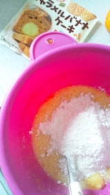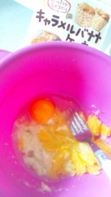 日本食研のファンサイトファンサイト応援中 日本食研さんのキャラメルバナナケーキの素が 届きました♪ 今日のおやつに久々パウンドケーキ作るぞ!! 作り方はとっても簡単! パッケージの裏に分量と作り方書いてあって バナナと卵と油と粉を混ぜて焼くだけで キャラメルバナナケーキができちゃうのです! 自宅の冷蔵庫にオレンジを6個買ってきたのが あったので、オレンジ×バナナにしようと思います( ̄▽+ ̄) バナナ2本の分量だけど、オレンジ入れるから1本半 半分をフォークでつぶしてオレンジは野菜洗いの洗剤で よく洗ってから半分上に乗っける分スライスして 残り半分を皮をむいて実を一緒に混ぜて よく混ぜたら卵1個と油大匙3を入れて よく混ぜたらミックス粉を入れて混ぜ混ぜ 袋を開けたらキャラメルの香ばしい香りがプンプン!! 匂いですっごく甘いのかなぁっと錯覚 混ぜたものを型に3分の1流しいれて バナナ1本を入れて、さらに上から流しいれて スライスしたオレンジを並べて 余熱200度にしたオーブンで30分焼いたら 出来上がり♪ うん!いい感じ! 焼けるまでにフルーツむいてる私に 息子っちが興奮して今食べていいの?? まだ?? っとしつこいww いつもおやつはフルーツが主なのでねw でも今日はケーキ焼いてるから待っててねー!っと 焼きあがるまでに10回はまだー?? まだー??っと走ってきてましたけど 冷ましてカットしてみました んーちょっとオレンジ果汁多すぎたかなぁ; しっとりのパウンドケーキになりました! でもうんまーでしたよw 袋開けた時の香ばしい甘ったるいキャラメルの香りも そこまでしなくって、ほんのり香ってとってもおいしかった! こんだけ簡単においしくできるのでとってもよかったです! 待ちに待ったケーキが食べれた息子っちw おいしーうれしーだそぅw てか日本食研さんのHP見たらアレンジレシピ で オレンジケーキの作り方載ってたww ある意味奇跡( ´艸`)プププ キャラメルバナナケーキの素 続きを見る ['close']