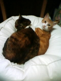 男子(茶白)は、左手を肩にまわしてご満悦女子(キジトラ)の微妙な表情が 対照的なのです 滅多に一緒に寝てもらえず、いつもウザがられているカワイソウな彼の めずらしく幸せな一瞬でしたよかったね★