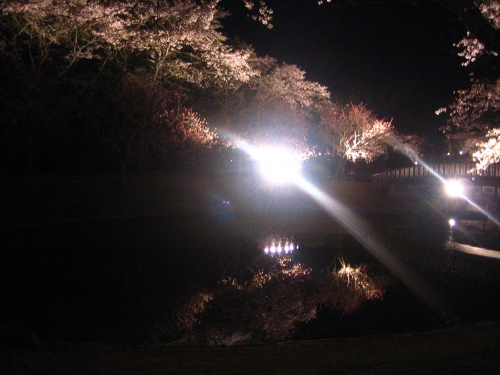 ライトアップされた夜桜が、湖に反映されてロマンチックです