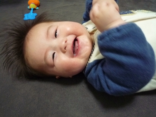 文字通りごろごろ転がりながらなぜか笑いが止まらなくなっています 6カ月になったばかりの息子のこの笑顔に毎日癒されています