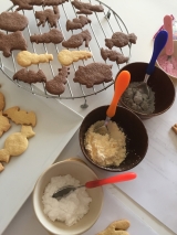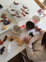 もうすぐハロウィンですね^^"> うちは今日娘と一緒にハロウィンのアイシングクッキーを作りました♡ 材料は共立食品株式会社さんのこちら^^ ★クッキーミックス粉 ★ハロウィンアイシングシュガー ★トッピングハロウィンシュガー ★ココアパウダー ★絞り出し三角紙 クッキーを作るための材料♪ アイシングの材料♪ 気になるアイシングシュガー封を開けるとこんな感じです アイシングシュガーは4色!白、オレンジ、パープル、黒 ハロウィンカラーです^^ これだけの色が揃ってれば大満足♡ 早速!クッキーミックス粉を半量づつ使って プレーン生地とココア生地を作りクッキーを焼きました! もちろん、クッキーの抜型選びも娘が^^ このクッキー生地とっても扱いやすくてアイシングクッキー用の型って細かいものが多いのだけれど とってもきれいに抜けて大満足^^ 焼き上がりを待ちかねて早速アイシングにとりかかります アイシングシュガーをそれぞれ器に入れて準備完了! このアイシングシュガーに水または牛乳または卵白をくわえてくださいということだったので わたし、いつもは卵白で作るのだけれど 今回は子供と一緒に作るので水をくわえました^^ お水は慎重にくわえましょう! どばっとお水を入れてしまうとトロトロになってうまくできません 今回、黒色お水くわえすぎました^^; 黒色トロトロでしたがなんとかできましたよ アイシングをはじめたら びっくりするくらい真剣な娘!!!!! 先に紙にどんなアイシングクッキーをつくるかっていう下書き?! のようなものを一緒に書いてたからか どんどん色やトッピングをのせて仕上げていきました@@ わたしのほうが 悩んでなかなか進まないw こういうのは子供のほうが発想力があって素敵な作品ができますね^^ で 仕上がりはこちら♡ トッピングハロウィンシュガーがいい仕事してくれました♡ これがあるのとないのでずいぶん仕上がりが違うと思う 子供が作るのだったらトッピングシュガーはあったほうが楽しいと思いました♪ もちろん大人も楽しめました^^ こちらは娘のを集めたもの♪ こちらはわたし^^; はじめて娘と一緒アイシングクッキーを作ったのだけれど とっても楽しっかった!!! 「すっごく上手につくれたねぇ!」とわたしが褒めると 娘が「おかあさんもとっても上手だよ♡また一緒に作ろうね♡」って とっても楽しかったよう^^ 仕上がったアイシングクッキーはハロウィンにはちょっと早いけれど今日のおやつに^^ これ(娘の名前)が作ったんだよ♪ おいしいね♪って家族で話しながら 楽しいおやつタイムになりました♡ こんなに喜んでくれるならまた一緒に作りたい♪ クリスマスアイシングシュガーやクリスマストッピングシュガーも出てくれるといいな^^ http//moniplajp/bl_rd/iid3250008858070a7c27814/m4d4f8a3dde733/k1/s0/ 続きを見る