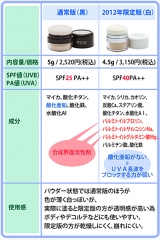 もうすぐ金環日食ですね日食眼鏡はかわれましたか私は今日探しまわってやっと買ったので高くつきました太陽と言えば紫外線 UV対策 以前ご紹介したポンポンチークのような日焼け止めの、グレードアップ限定版をお試しする機会をいただきましたのでご紹介します強引につなげてみましたよ以前の記事 「ぽんぽんするだけ肌に優しい日焼け止めパウダー」 以前紹介したのはこちら 通称「黒」の「ミネラルSPFパウダー/SPF25PA++」今回新たに比較するのがこちら 通称「白」の『ミネラルUVパウダー』SPF40PA++ パケのお帽子が白くなりましたねどちらのぽんぽん日焼け止めも既に色々な美容ブロガーさんが丁寧にご紹介されているので、今回は通常版と2012年限定版の比較記事にしようと思います 通常版と限定版、どちらを買えばいいのか迷われる方がお値段やSPF値だけではなくじっくり比較できるような資料になればうれしいです♪ ということで比較した表を作ってみました まず、内容量と価格限定版(白)の方が内容量が少なくややお高いここからもやはりグレードアップしたんだなぁとわかりますね 続いて、SPF値とPA値限定版(白)の方がSPF値が高い! それなのになぜか使用感がよいのですよSPF値が上がっているのに限定版のほうが、乾燥せず、仕上がりに透明感あり、崩れにくい! えそれなら限定版(白)の方買うでしょ!って思いません?でも実は色々比較検討する余地があるのです 次の成分の項目を見てください通常版(黒)にある酸化亜鉛が限定版(白)にはないのです酸化亜鉛に関してはぽれっちさんの記事を見ていただくとよくわかりますが(ぽれっちさんの記事へ★★★)簡単に言うと乾燥を促しやすいのです酸化亜鉛が乾燥を促しやすいということは=粉うきした仕上がり=崩れやすくなる それが限定版(白)には入っていないし、さらに保湿成分リポアミノ酸配合でより乾燥しづらく、さらにさらにリポアミノ酸のコーディングで密着度が増し、くずれにくいというわけです ただ、酸化亜鉛は乾燥を促すとはいえ酸化チタンだけではUVA長波を防ぐのは厳しいといわれています限定版(白)の紫外線錯乱剤は酸化チタンのみUVAはPA値でどれだけ効果があるのか表示されていますが限定版(白)と通常版(黒)どちらも同じ++ですね限定版(白)には酸化亜鉛が入っていないのになぜ同じ++なのでしょう多分UVA短波は酸化チタンでも防御効果ありといわれていますのでUVA短波に対してPA++なのではないでしょうかUVAには短波と長波があり、短波を防いでも長波はお肌に届いています またまた引用しちゃいますがぽれっちさんも書かれていた通り限定版を使用される場合は下地やファンデなどで適度に酸化亜鉛が配合されているものを併用される方がより安心だと思います さらに限定版(白)の成分の項目で成分厨の私がみのがせないものが赤字で書かれた3つは合成界面活性剤なのでした 個人的にはズコって感じでしたよ まあ、普通の方にはなんてことない問題ですが私含め成分厨の方々はMMUパウダーと同じ感覚で買っちゃわないよう注意が必要です ただ、限定版(白)のほうが透明感があるので酸化亜鉛が配合されたパウダーファンデの上からやデコルテなどに使用していこうと思います 私だけの目線では情報が偏ってしまいますし、書ききれなかった良いところも(悪いところもね)ありますので是非他のブロガーさんの記事もあわせて参考になさってください 通常版(黒)ぽれっちさん 【 化粧直しにぜひとも持ち歩きたい日焼け止めパウダー!】 きーよさん 【チークじゃないよ、日焼け止めだよ】 2012年限定版(白)ちりーたさん 【新発売!ピタッと密着、乾かないミネラルUVパウダー SPF40PA++】 micaさん 【エトヴォスの新しいポンポン日焼け止め!SPF40PA++「ミネラルUVパウダー」】ぽれっちさん 【エトヴォスのUVパウダー(限定アイテム)】文字だらけで読みにくくてすみませんここまで読んでくださった方に感謝ですではミネラルコスメのetvosファンサイト参加中 続きを見る ['close']