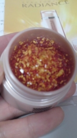 こんち" /> 今日もお勤め行ってきました なんだかこの3連休は思ってたよりも人出がなかったような みんな3連休だからってお出かけしてたのかなぁ お勤め中は汗かくし、しかもエアコンもなので夏だけど乾燥注意報です そこで試しました ゴールドラディアンスクリアジェル 保湿&エイジングケアもしてくれるジェルです ピーリングかパックかの使い方ができるんだけど、 あたしはとりあえずピーリング おうちでエステ気分味わえたよ 中身はこんなかんじ 純金箔がいーっぱい この純金箔とナノゴールド配合で、お肌に浸透しやすくって エイジングケアをみっちりしてくれるんだってー お肌の不要なものを取ってくれて、お肌の状態を整えてくれるすぐれものです 実際お肌にとってみると、このジェル弾力ありな感触です 鏡見ながらマッサージ始めたんだけど、頬にのせたジェルが水平に立ってたよー それを伸ばして伸ばして純金箔がなくなるまでマッサージ マッサージ中から、なんだかこのジェルの弾力にあわせてお肌まで プルっとしてきた感ありだよー こんなふぅにお肌をいたわってあげることなかったから、 自分でやってるのに気持ちい感じー しかもね、ローズのいい匂いだからこれまた癒されるしねー 洗い流すと、やっぱりちょっとハリが出たような感触だったよー これって続けたらこうなるのかなって思いました 洗い流したあともうるおいが続くし、お肌が柔らかいっていうのかな なんかうまく言えないけど、いつものペトっとした感触じゃなくて、 やっぱり柔らかいって言うのが一番かも こういうのがあると、お化粧のときだけじゃなくて お肌をお手入れできる時間をもてるので、いいなぁって思いました ちゃんと最後まで引き続き使ってみたいと思います 育毛情報ナビ/モンゴ流シャンプーファンサイト応援中 続きを見る