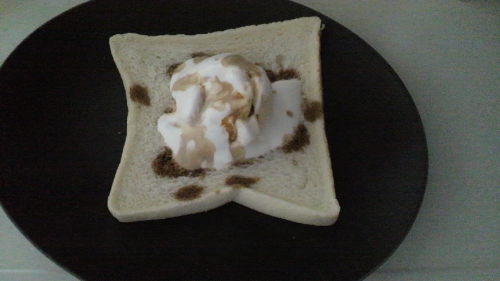 焼いた食パンに バニラアイス、生クリームをのせて コーヒーエキスをかける! 美味しそう♪