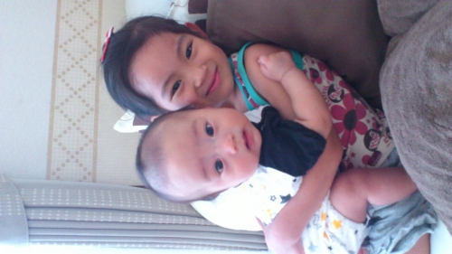 生後4ヶ月の弟の首が座り、5歳のお姉ちゃんが初めて抱っこしている写真です お姉ちゃんの緊張気味のお顔と、弟のカメラ目線がたまりません♪ 可愛いすぎですよね?!(笑) 是非ステッカーによろしくお願いします