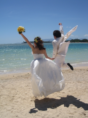 09年の5月にハネムーンで訪れたHawaii!! 初めてのHawaiiで初めてのウエディングドレス♥ こんなにも綺麗な海でテンションMaXな状態です^^ 実はこの海、普通の海水浴場なんです 50メートル位先には海水浴を楽しんでる方達がいるんですよ・・・笑